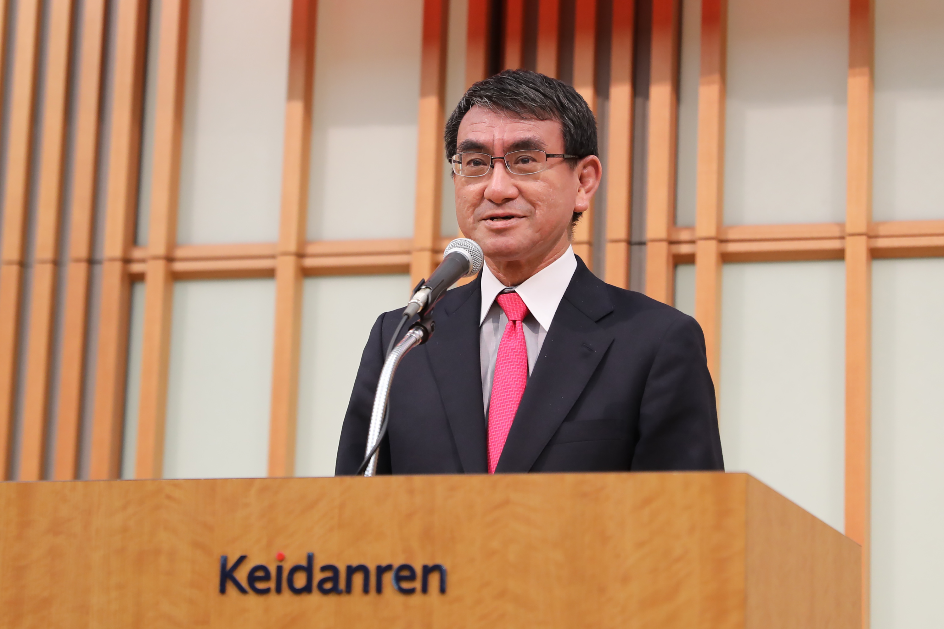 2018年12月3日,在日本东京,日本外务大臣河野太郎在研讨会的招待会上致辞。(新华社记者杜潇逸摄)